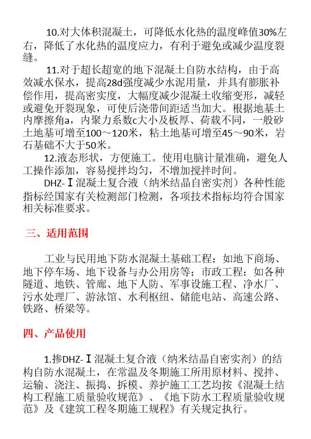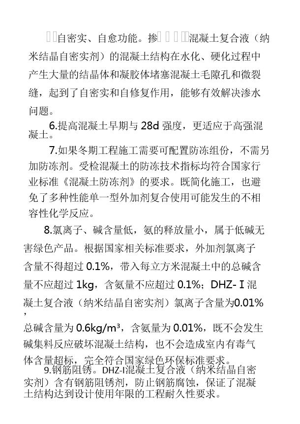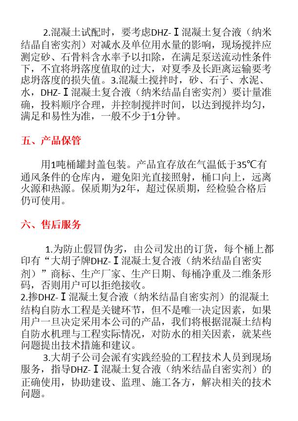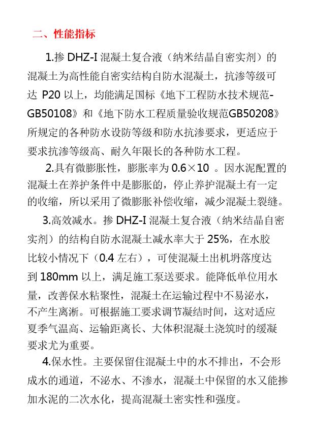 DHZ-I混凝土復合液(納米結(jié)晶自密實劑)(普通型)摻量為膠凝材料總量的3%~3.5%,后澆帶、加強帶摻量為5%,實際摻量可通過試配確定。