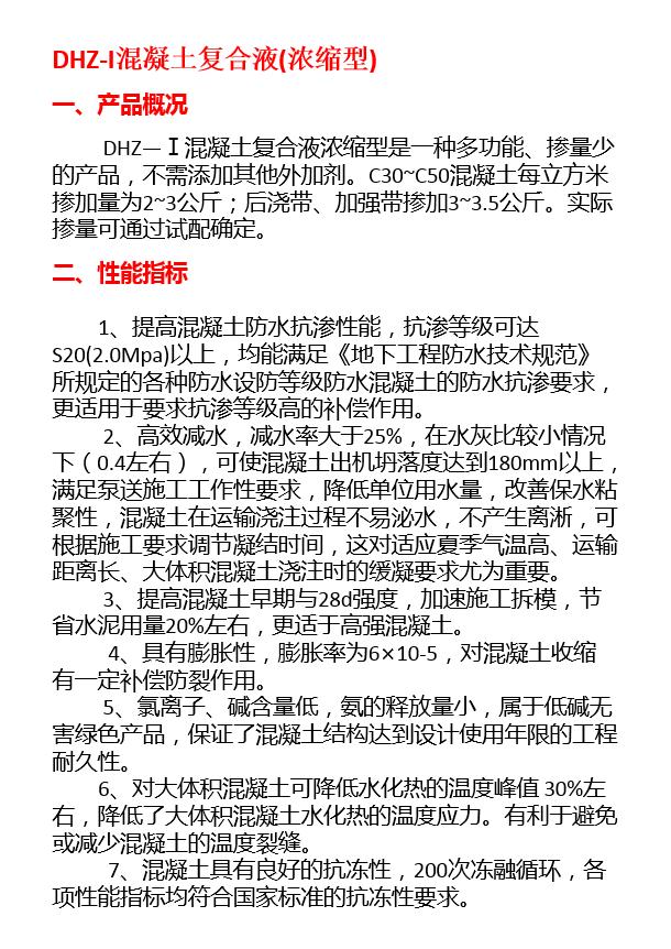 DHZ-I混凝土復合液(納米結(jié)晶自密實劑)(濃縮型)混凝土每立方米摻量為2~3公斤,后澆帶、加強帶摻量為3~4公斤,實際摻量可通過試配確定。