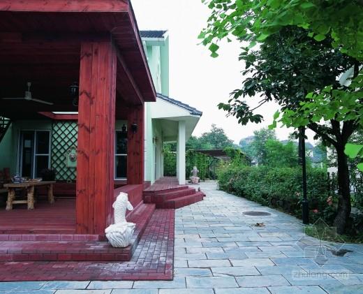 圖2 立柱上的棗紅木紋漆加上同樣顏色的仿磚涂料,墻體的白色憎水乳膠漆,周圍的綠蔭環(huán)繞。打造出經(jīng)典的美式田園風,生活在愜意的優(yōu)美環(huán)境中,讓人們的心情也更加愉悅。