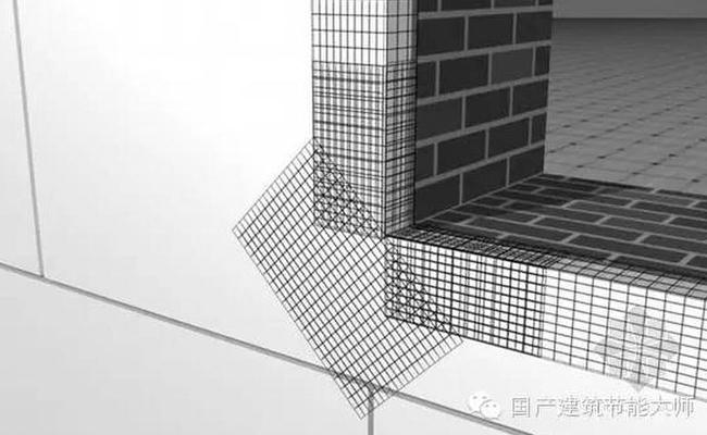 6,拐角部位,網(wǎng)格布要保持連續(xù)性,并從兩邊雙向繞角,包墻寬度陽角處不小于200mm,陰角處不小于100mm