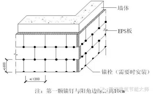 以涂料為外飾面時,錨栓可安裝在EPS板上。錨栓安裝應在膠粘劑干燥24h后進行。在抹面砂漿在未硬化的狀態(tài)時安裝錨栓,會比較方便,玻纖網(wǎng)格布也不會發(fā)生起皺、拉扯等現(xiàn)象。如過晚打入錨栓引起錨盤周圍防護面層有細微裂紋,如有細微裂紋應立即涂抹抹面砂漿修補,并酌情埋入網(wǎng)格布。