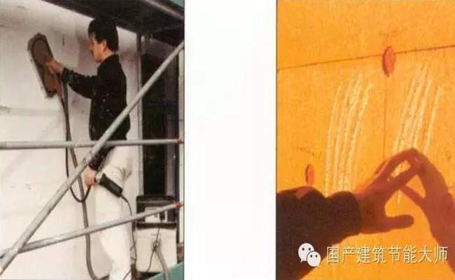 EPS板面的平整度及板縫的高低接茬不但影響到外保溫系統(tǒng)的外觀,抹面層干燥收縮時易在高低板縫接茬處以及厚薄不均的地方產(chǎn)生應力集中而開裂。因此在EPS板粘貼時一定要在吊線、拉線的幫助下滿足平整度,并在膠粘劑干燥一天后,砂漿達到一定粘結(jié)強度時,用專用工具對保溫板表面不平處進行打磨,打磨動作最好是輕柔的圓周運動,打磨后應用刷子將打磨操作產(chǎn)生的碎屑清理干凈。進行必要的打磨工作,不得有讓防護面層及飾面層來進行找平的想法。