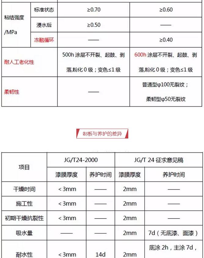 2、修改了試樣制備方法、樣品厚度、初期干燥抗裂性的試驗時間、耐人工老化性時間,標(biāo)準(zhǔn)狀態(tài)粘結(jié)強度技術(shù)指標(biāo);