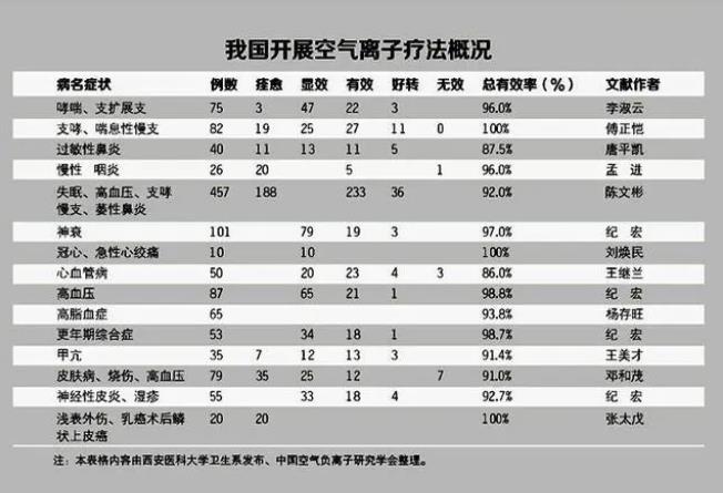 自上個世紀,我國醫(yī)學界就已經開始探索負氧離子對人體多種疾病的治療,并將其應用到臨床上,取得了非常理想的效果。下圖是西安醫(yī)科大學衛(wèi)生系發(fā)布,中國空氣負離子研究學會整理的關于我國開展空氣離子療法的概況。由此可知,我國已經將負氧離子療法應用于人體多種疾病的緩解與治療上,效果也非常之理想。負氧離子療法用于多種疾病的治療,可有效降低諸多藥物對患者身體產生的副作用與損害,同時提高疾病治愈率,減少患者的痛苦。