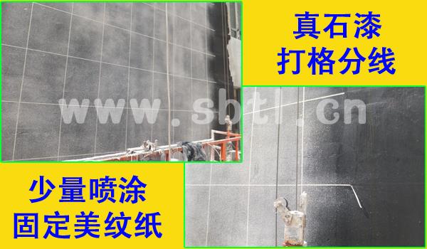 在真石漆施工時(shí),打格分線是很重要的環(huán)節(jié);但大風(fēng)天氣時(shí),美紋紙很難固定。解決的辦法也很簡(jiǎn)單,在貼上美紋紙后,迅速少量的噴上一次薄薄的真石漆,會(huì)起到很好的固定作用。